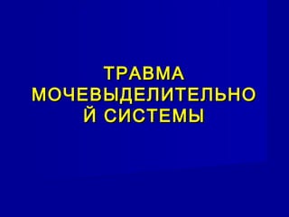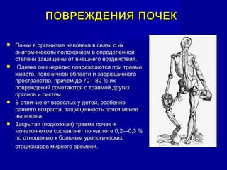 Документ охватывает травмы почек и мочевыделительной системы, подчеркивая их уязвимость к внешним повреждениям, особенно у детей. Описываются типы травм, их классификация, клинические проявления и методы диагностики, а также методы лечения, включая консервативные и оперативные подходы. Указаны симптомы, результаты обследований и конкретные показания к хирургическому вмешательству.