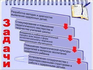 Документ описывает систему работы с одаренными детьми, акцентируя внимание на важности выявления и развития их потенциала. Приводятся принципы индивидуализации обучения и методы диагностики одаренности, а также примеры образовательных мероприятий и исследовательской деятельности. Основная цель - создание условий для реализации творческих способностей учащихся через совместную работу учителей и учеников.