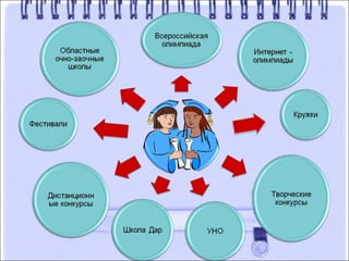 Документ описывает систему работы с одаренными детьми в России, акцентируя внимание на важности выявления и развития их потенциала. Он предлагает принципы индивидуализированного обучения и включает методы диагностики одаренности, а также подчеркивает необходимость просветительской работы среди учителей и родителей. В документе также упоминаются различные мероприятия и программы, направленные на развитие одаренности через исследовательскую деятельность.