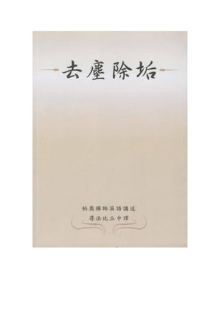 《去塵除垢》是帕奧禪師於1999年所作,旨在幫助初修禪者克服修禪過程中的五蓋障礙。文中討論如何對治欲望、瞋恨、昏沉、掉舉與疑等心污染,以及如何培養正確的禪修態度。此書提供了實用的修行建議,期望讀者能夠更順利地達到解脫。