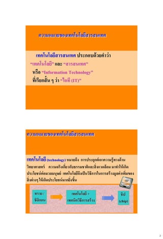 Technology” ที่เรียกสั้น ๆ ว่า “ไอที (IT)” ความหมายของเทคโนโลยีสารสนเทศ เทคโนโลยี(technology) หมายถึง การประยุกต์เอาความรู้ทางด้าน วิทยาศาสตร์ ความจริงเกี่ยวกับธรรมชาติและสิ่งแวดล้อม มาทาให้เกิด ประโยชน์ต่อมวลมนุษย์ เทคโนโลยีจึงเป็นวิธีการในการสร้างมูลค่าเพิ่มของ สิ่งต่างๆ ให้เกิดประโยชน์มากยิ่งขึ้น ทราย / ซิลิกอน ชิป (chip) เทคโนโลยี + เทคนิควิธีการสร้าง
