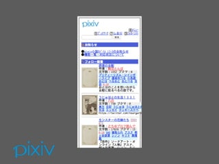 2015年4月1日にリリース 対象プラットフォームは i-mode/EZweb/Yahoo!ケータイ(勝手サイト) 旧ピクモバと交代のかたちでリニューアル シンプルなサービスを設計したかった (現代)pixiv小説モバイル