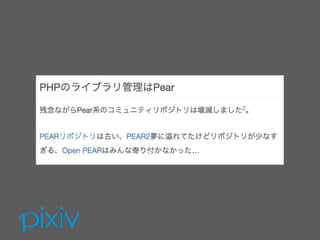 pixivはフレームワークを利用しないPHP なので、抽象度の低いコードが多め ボイラープレートを減らしたかった 正直言って、既存フレームワークは ぴんとこなかったところもある なぜフレームワークか