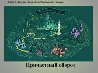 Документ содержит анализ причастного оборота на примерах из сказки А. Волкова «Волшебник изумрудного города». Он объясняет природу и функции причастия, а также показывает, как причастие может сочетаться с другими частями речи. Основное внимание уделяется структуре и правилам использования причастного оборота в предложениях.