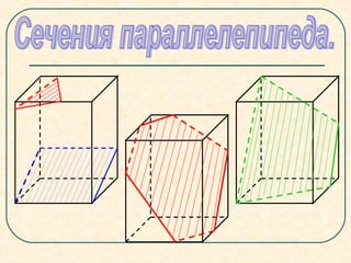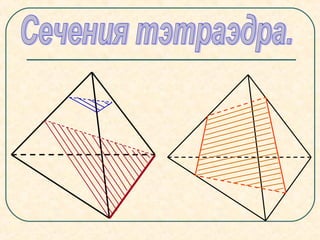 Документ представляет собой план урока по геометрии, посвященный секущим плоскостям и их сечениям на примере тетраэдров и параллелепипедов. Урок включает задачи на построение сечений, правила соединения точек на гранях и примеры получения различных фигур (четырехугольников, треугольников и шестиугольников) в результате пересечения с плоскостями. В документе также описываются конкретные этапы построения сечений для разных геометрических фигур.