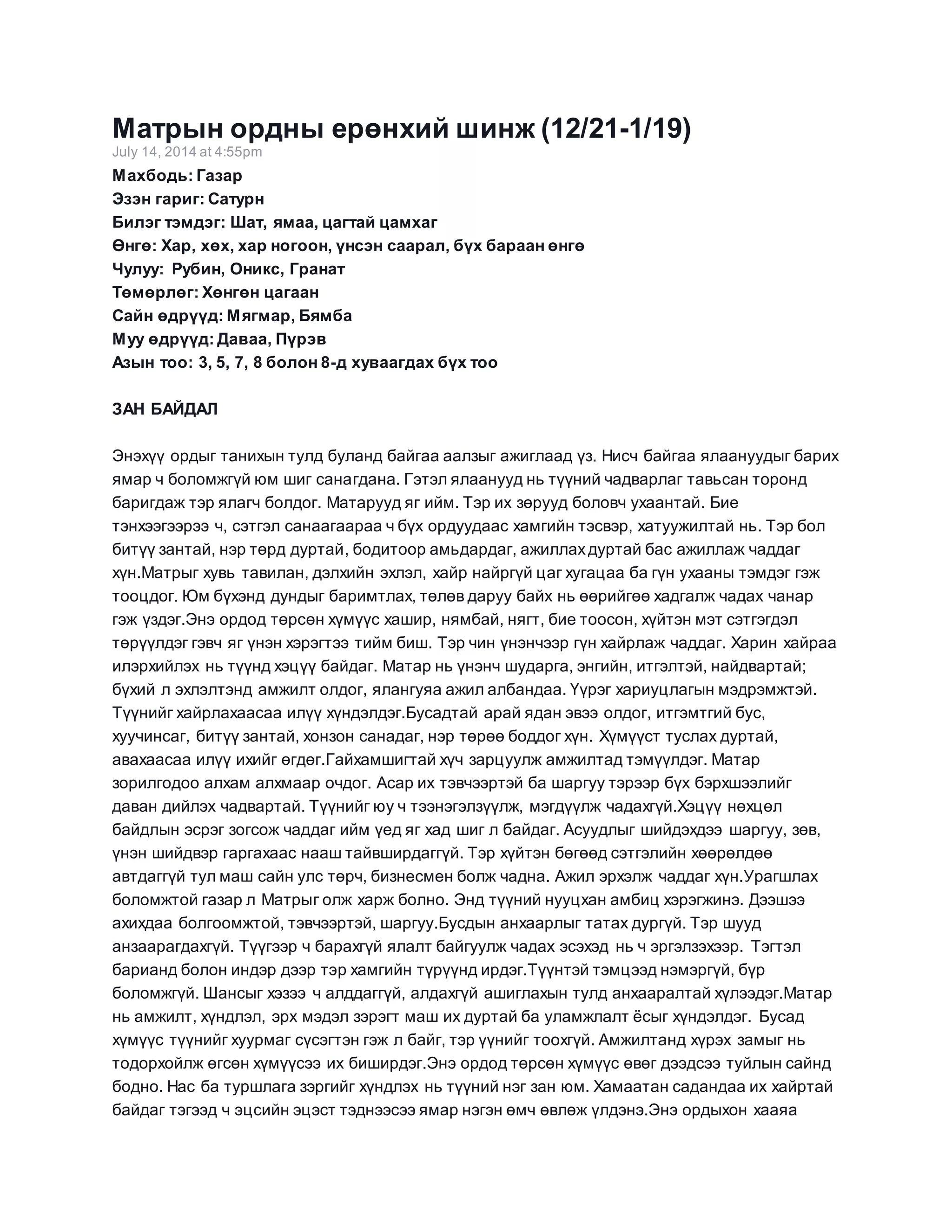 Матрын ордны ерөнхийшинж (12/21-1/19)
