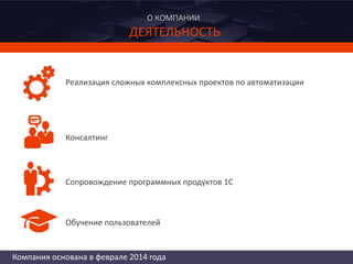 Компания, основанная в феврале 2014 года, занимается реализацией сложных проектов по автоматизации и консалтингу в области программных продуктов 1С. Она имеет статус '1С:центр компетенции' и сертификат ISO 9001:2008, а также предлагает широкий спектр услуг, включая комплексную автоматизацию бизнес-процессов и внедрение ERP-решений. Компания активно работает на рынках России и СНГ, имея опыт успешной автоматизации в различных отраслях, таких как строительство и медиаиндустрия.