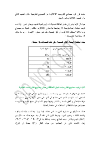 تستعرض الوثيقة تقنيات توفير الطاقة باستخدام مصابيح الفلورسنت ذات الكفاءة العالية كبديل للمصابيح التقليدية، مشيرة إلى فوائدها في تقليل استهلاك الطاقة والتكاليف. كما تتناول طرق تركيب هذه المصابيح وأحجامها المختلفة وقدرتها على التحسين من أداء الإضاءة وتقليل التأثيرات الضارة على البيئة. أخيرًا، تسلط الضوء على أهمية إعادة تدوير مصابيح الفلورسنت والتخلص منها بشكل صحيح لتجنب التلوث البيئي.
