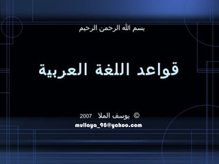 الوثيقة تحتوي على ملخص شامل لقواعد اللغة العربية، موضحة أقسام الكلام وأحكامها المختلفة مثل الاسم والفعل والحرف. تتناول أيضًا تفاصيل حول علامات الإعراب، والأسماء الموصولة، والمثنى والجمع، بالإضافة إلى أدوات الربط وأفعال المدح والذم. تُعتبر مرجعاً تعليمياً هاماً لمن يرغب في فهم قواعد اللغة العربية الأساسية.