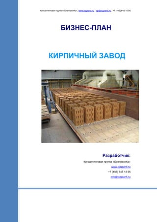 Документ представляет собой бизнес-план для кирпичного завода, разработанный консалтинговой группой «Бизпланико». Он включает в себя всесторонний анализ рынка, индивидуальные финансовые модели и сценарии развития, а также различие между качественными и некачественными бизнес-планами. Группа предоставляет гарантии результативности и удовлетворенности клиента, подтверждая опыт в разработке более 350 бизнес-планов в различных отраслях.