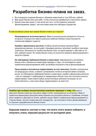 Консалтинговая группа «бизпланико» разрабатывает индивидуальные бизнес-планы для создания бизнеса в разных отраслях с объемом инвестиций от 3 до 500 млн. рублей. Компания предлагает всесторонний анализ рынка, финансовое моделирование и разработку сценариев для оптимизации инвестиционных решений, а также гарантирует качество работы и клиентскую удовлетворенность. За более чем 5 лет они разработали более 350 бизнес-планов, помогая клиентам успешно запускать проекты и привлекать финансирование.