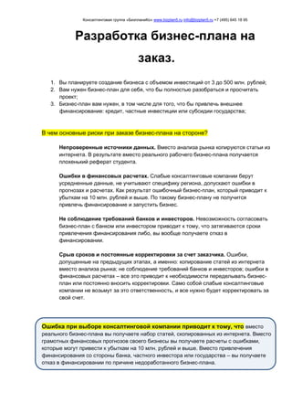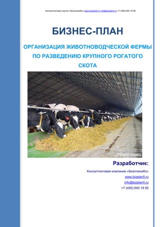 Документ представляет собой бизнес-план для организации животноводческой фермы по разведению крупного рогатого скота, разработанный консалтинговой группой «бизпланико». Он включает всесторонний анализ рынка, финансовую модель и три сценария развития проекта, а также учитывает специфику региона. Основное внимание уделено избежанию распространенных ошибок при разработке бизнес-планов и необходимости привлечения качественных консультантов для получения успешного результата.