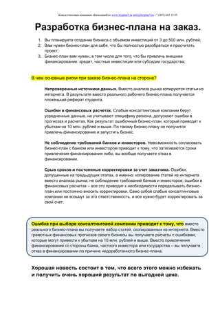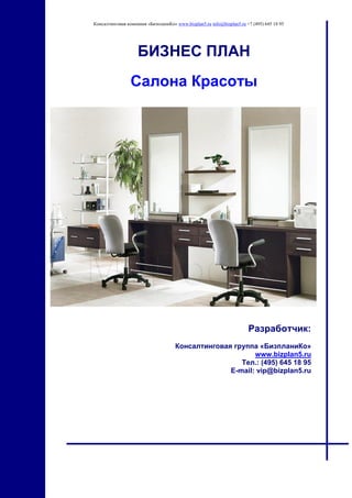 Документ представляет собой бизнес-план для салона красоты, разработанный консалтинговой компанией 'бизпланико'. Он включает в себя всесторонний анализ рынка, финансовые прогнозы, а также три сценария развития проекта для оптимизации инвестиций. Компания акцентирует внимание на важности качественного бизнес-плана для успешного запуска бизнеса и привлечения финансирования.