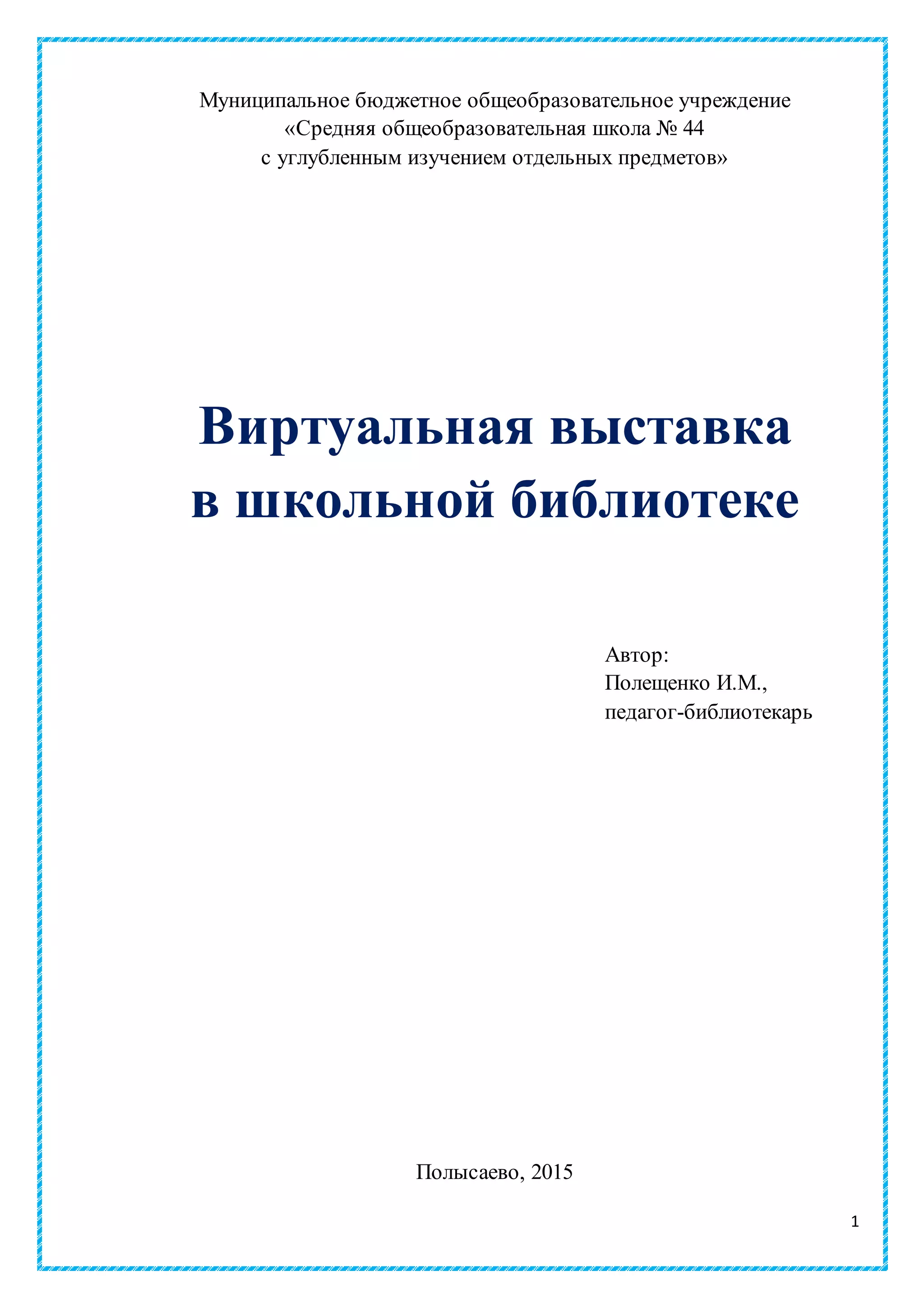 Документ описывает использование виртуальных книжных выставок в школьных библиотеках, подчеркивая их преимущества по сравнению с традиционными выставками, такие как доступность и экономия пространства. Также приводятся различные типы виртуальных выставок, включая презентации, видеопрезентации и электронные книги, а также программы для их создания. В завершение предложены курсы по созданию 3D-книг и обучению педагогов современным подходам к представлению информации.
