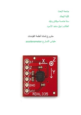 تتناول الوثيقة موضوع مقياس التسارع (accelerometer) واستخداماته في قياس التسارع والحركة. توضح الوثيقة كيفية عمل الجهاز وأهميته في التطبيقات اليومية، مثل الهواتف الذكية والمركبات. كما تناقش الأنظمة والمحاور المرتبطة بالتقنيات الحديثة وأهمية المعدات اللازمة للتجريب والبرمجة لتجارب قياس دقيقة.