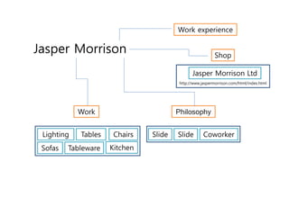 Jasper Morrison is a British designer known for furniture, lighting, and tableware. His website features his design philosophy and examples of his work across various product categories including tables, chairs, sofas, and kitchen items. Visitors can also learn about his work experience and shop at his design company Jasper Morrison Ltd.