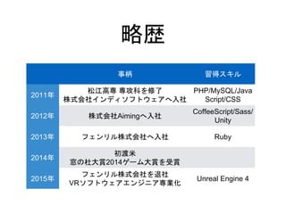 株式会社Aimingへ入社 CoffeeScript/Sass/ Unity 2013年 フェンリル株式会社へ入社 Ruby 2014年 初渡米 窓の杜大賞2014ゲーム大賞を受賞 2015年 フェンリル株式会社を退社 VRソフトウェアエンジニア専業化 Unreal Engine 4