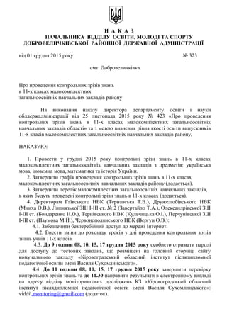 1. Провести у грудні 2015 року контрольні зрізи знань в 11-х класах