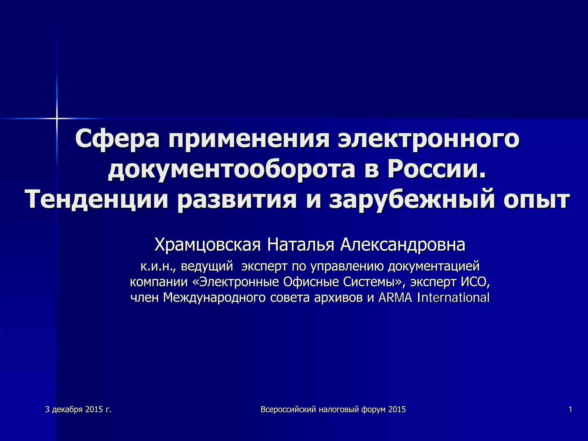 Документ анализирует состояние и тенденции развития электронного документооборота в России, подчеркивая его быстрое внедрение и значимость в различных областях, таких как судопроизводство и здравоохранение. Несмотря на достижения, остаются нерешенные вопросы, включая долговременное хранение электронных документов и необходимость правовой гармонизации с международными стандартами. В будущем ожидается дальнейшее преобразование бизнес-процессов, рост объемов электронных документов и усиление требований к информационной безопасности.