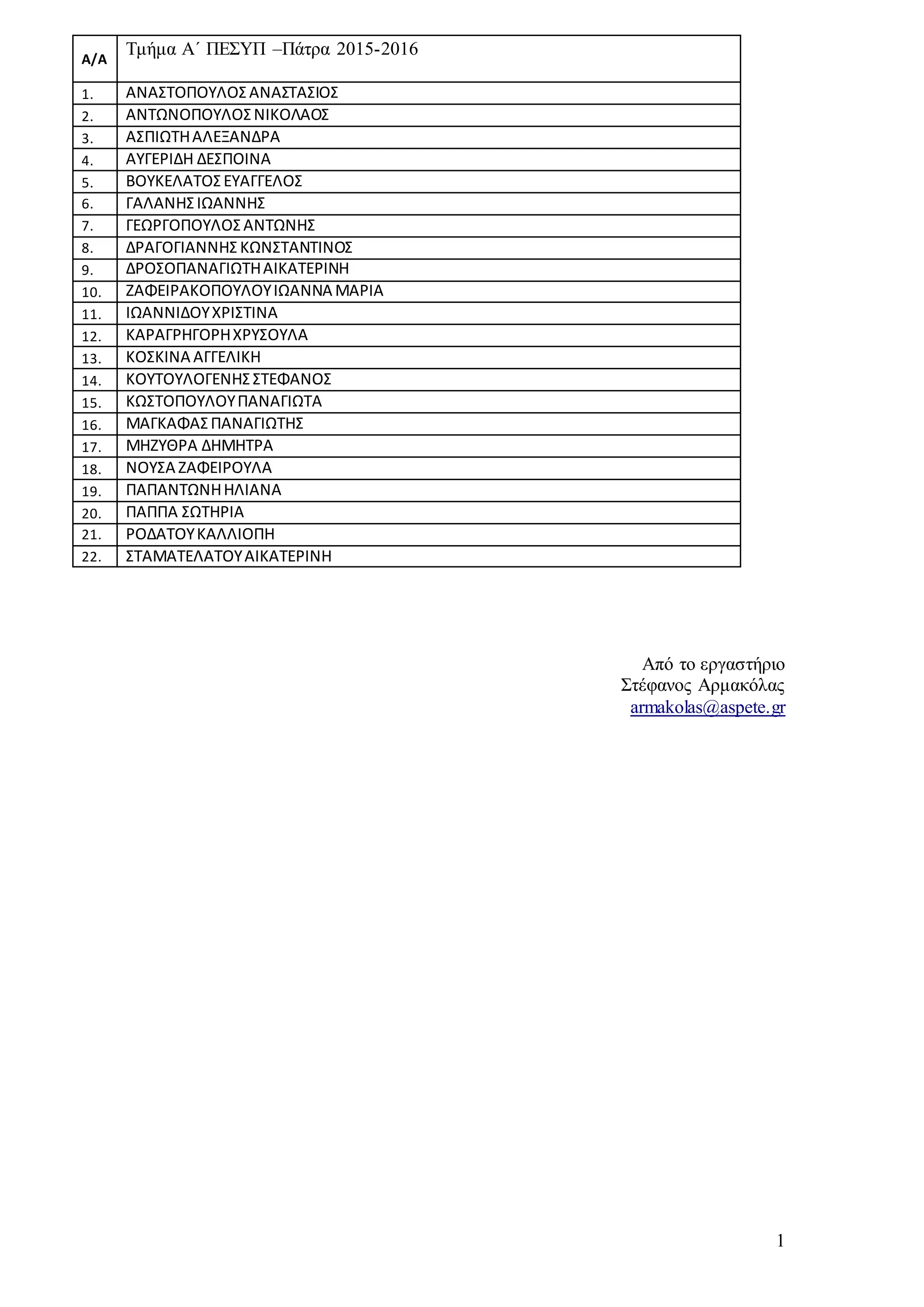 Τμήμα Α΄ ΠΕΣΥΠ–Πάτρα 2015-2016