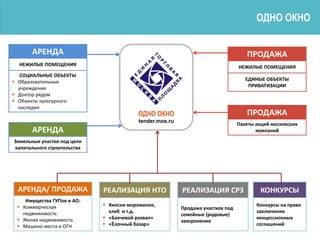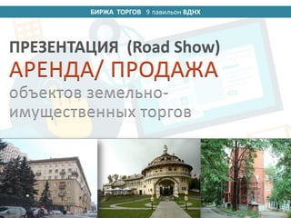 Документ описывает различные объекты недвижимости, выставленные на торги в Москве, включая аренду и продажу нежилых помещений, земельных участков и объектов культурного наследия. Указаны адреса, начальные цены, площадь, состояние объектов и другая важная информация. В документе также предусмотрены детали участия в торгах и условия аукционов.