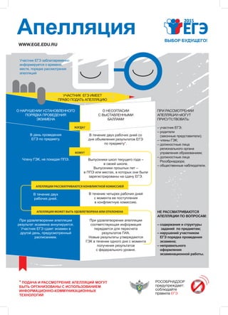 Документ описывает процесс подачи и рассмотрения апелляций участниками ЕГЭ в случае несогласия с результатами экзамена. Участники могут подать апелляцию через определенные каналы, и она рассматривается конфликтной комиссией в установленные сроки. При удовлетворении апелляции результаты экзамена аннулируются, и участник пересдает экзамен в другой день.