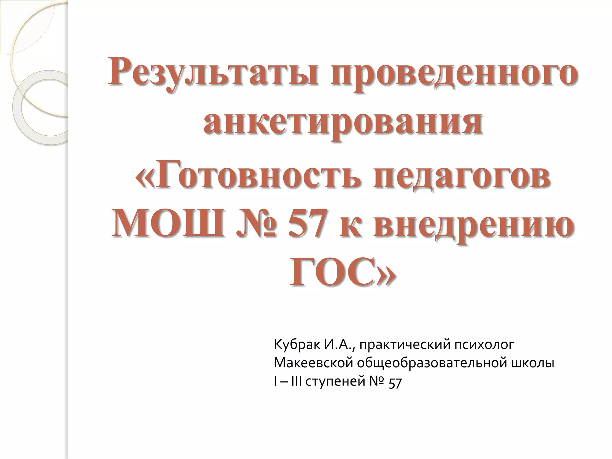 Документ содержит результаты анкетирования, касающегося готовности педагогов к внедрению государственного образовательного стандарта в Донецкой Народной Республике. В опросе поднимались вопросы о понимании термина 'государственный образовательный стандарт', уровнях образования, а также о готовности педагогов и учреждений к внедрению новых норм. Большинство респондентов выразили положительное мнение о влиянии этих стандартов на образовательный процесс и результаты обучающихся.