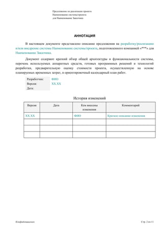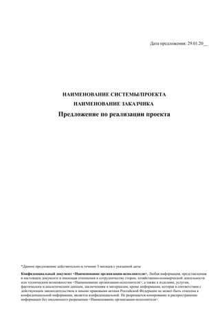 Документ представляет собой предложение по реализации проекта, разработанного для конкретного заказчика, включая описание системы, её архитектуры и функциональности, а также оценку стоимости и планируемые ресурсы. В нем содержится информация о сроках, рисках и необходимых ресурсах для успешного выполнения проекта. Документ является конфиденциальным и требует письменного согласия для копирования и распространения.