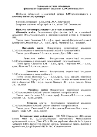 Проблема лабораторії: «Педагогічні виміри В.О.Сухомлинського в