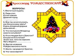 Документ посвящен празднику Рождества Христова, охватывающему его историю, символику и культурные традиции, включая описание рождения Христа в яслях. Также упоминается об ученых (волхвах), принесших дары, и о вифлеемской звезде, указывающей путь к месту рождения. В материале представлены различные источники и видеофильм, связанный с Рождеством Христовым, а также контактные данные для дальнейшего изучения темы.