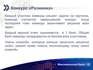Документ описывает конкурсные мероприятия, основанные на базе данных, включая викторины и практические задания с оценкой за правильные ответы. Участвующие команды решают задачи, получая баллы в зависимости от сложности вопросов и выполняя задания по созданию баз данных. Также представлены определения ключевых терминов, таких как база данных, предметная область, система управления базами данных и модели данных.