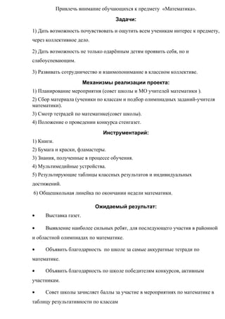Документ описывает проект 'Неделя математики' в староласпинской школе, цель которого - развить интерес учеников к математике через разнообразные мероприятия. Включает задания для всех классов, от выставки работ до конкурсных игр, что позволяет детям проявить свои творческие и интеллектуальные способности. Ожидается, что такие мероприятия укрепят взаимопонимание и сотрудничество в классном коллективе.