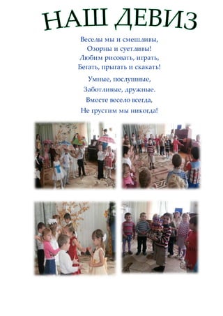 Документ представляет собой описание детской группы с характеристиками воспитателей и младшего воспитателя. Дети описываются как активные, дружные и любящие различные виды деятельности. Также упоминаются уголки для различных занятий и обучающих активностей в группе.