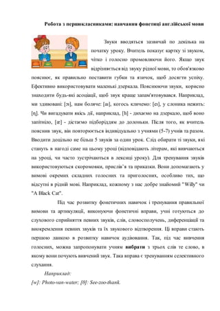 на уроці, чи часто зустрічаються в лексиці уроку). Для тренування звуків
