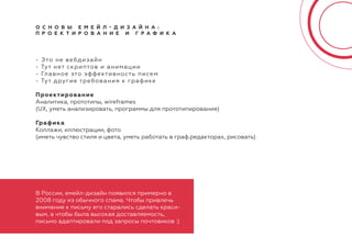 Документ обсуждает эволюцию емейл-дизайна, акцентируя внимание на его развитии с 2008 по 2014 год и подчеркивая важность графики и проектирования. Основное внимание уделяется процесса создания емейл-писем, включая этапы прототипирования и командной работы, а также использования шаблонов для повышения эффективности. Креативные решения в емейл-маркетинге рассматриваются как способ решения проблем и привлечения внимания, несмотря на высокие затраты.