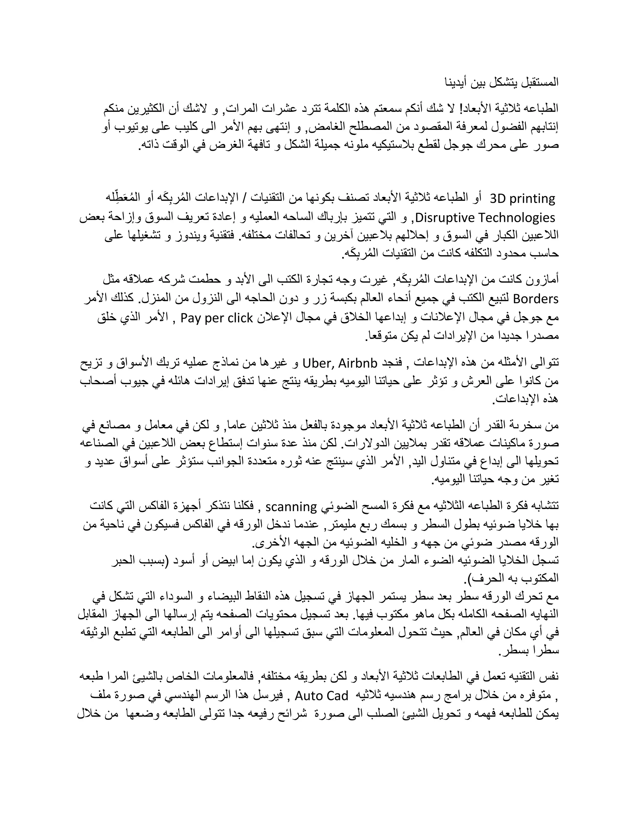 تتحدث الوثيقة عن تقنية الطباعة ثلاثية الأبعاد وتأثيرها على المستقبل، حيث تقوم بإعادة تعريف عدة مجالات من حياتنا اليومية. تتناول أمثلة على ابتكارات مثل أمازون وأوبر، وكيف يمكن لهذه التكنولوجيا أن تساهم في تسريع العمليات الصناعية والطبية. كما تشير إلى أن هذه التقنيات يمكن أن تُسهل الإنتاج المحلي وتوفير قطع الغيار بسرعة وكفاءة.