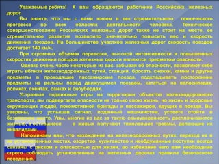 Документ обращается к гражданам, подчеркивая опасности, связанные с нахождением на железнодорожных путях и вблизи них. Он призывает соблюдать правила безопасного поведения, чтобы избежать травм и смертельных случаев. Представлены конкретные рекомендации по безопасному переходу через пути и поведению на территории железнодорожного транспорта.