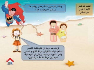 تتناول الوثيقة قصة ليلى، وهي فتاة ذكية تتعلم عن حروف الجر وحركات اللغة العربية من خلال محادثات مع شقيقاتها. تتعرف على كيفية تشكيل الكلمات ونهاياتها، وخاصة الأسماء والأفعال، مما يساعدها في فهم اللغة بشكل أفضل. القصة تتضمن دروس تعليمية حول اللغة بأسلوب قصصي ممتع.