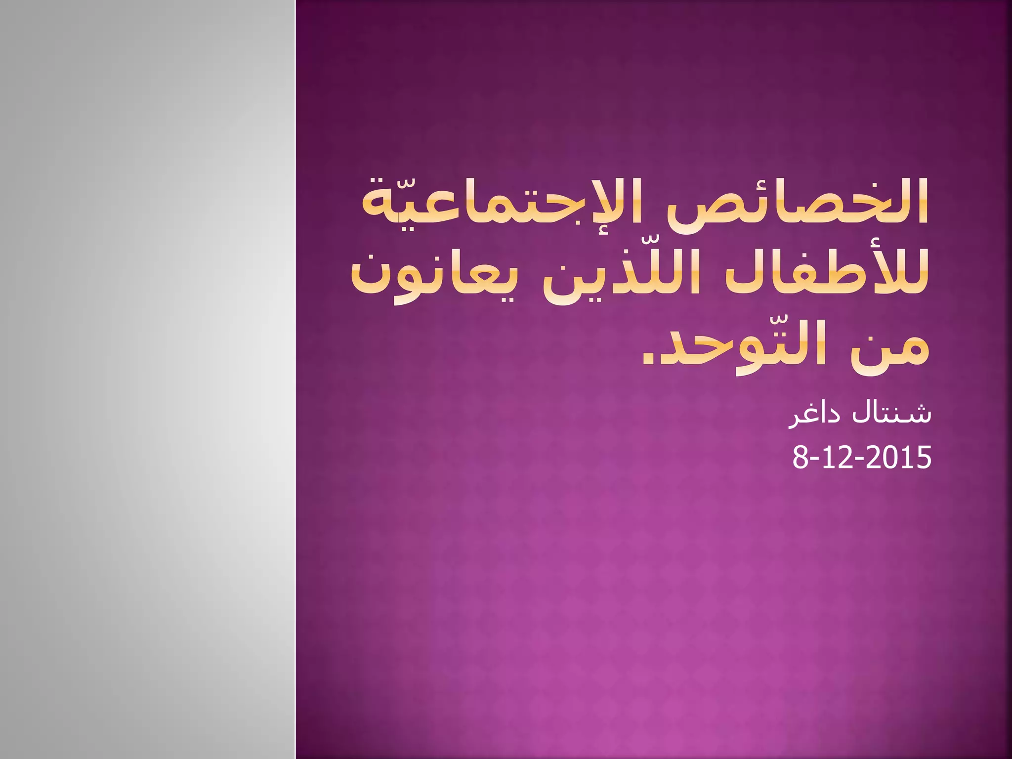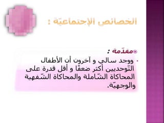 يتناول الوثيقة مشكلات الأطفال ذوي التوحد وتأثيرها على تفاعلهم الاجتماعي، مشيراً إلى نقص المهارات التواصلية والعزلة الاجتماعية كعوامل رئيسية. ويمضي في توضيح جوانب متعددة تشمل ضعف الاستجابة للأقران، وعدم إدراك التعبيرات الاجتماعية والمشاعر. كما يبرز أن الأطفال المصابين بالتوحد قد يعانون من صعوبات في تطوير علاقات اجتماعية طبيعية وفهم مشاعر الآخرين.