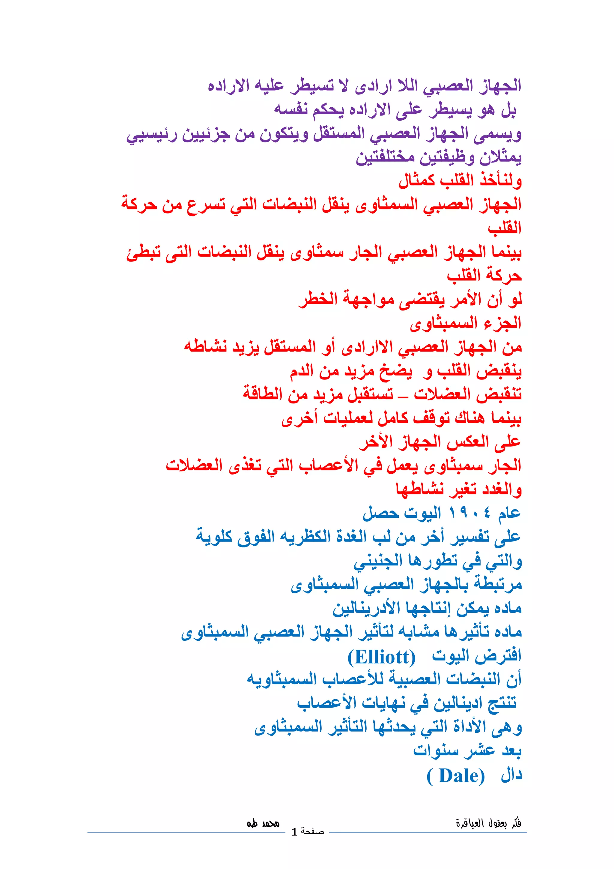 تتناول الوثيقة الجهاز العصبي وخصائصه، بما في ذلك كيفية نقل النبضات والتفاعل بين النظامين السمبثاوي والباراسمبثاوي. كما تقدم أمثلة على استجابة الجسم ونقل الإشارات العصبية، مشيرة إلى الدور الحيوي للأعصاب في التحكم في النشاط العضلي والغدد. الوثيقة تستعرض أيضًا بعض التجارب والدراسات على خصائص الأعصاب واكتشافاتها المهمة.