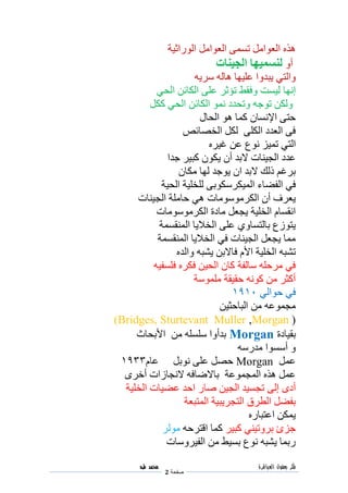 تناقش الوثيقة تطور فهم الوراثة من خلال أبحاث العلماء مثل مندل ومورغان ومولر، حيث تناولت أهمية الجينات وتأثيرها على خصائص الكائنات الحية. كما تستعرض الطرق التجريبية المستخدمة في دراسة الوراثة وكيفية حدوث الطفرات. يشدد النص على العلاقة بين الجينات والخصائص الوراثية وتأثير العوامل الخارجية على هذه الخصائص.