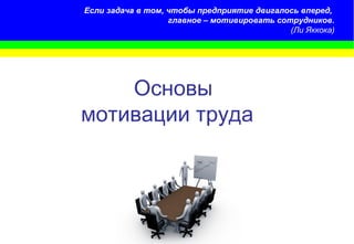 Документ исследует основы мотивации труда, подчеркивая её важность для управления персоналом и достижения целей компании. Описаны ключевые понятия, такие как потребность, мотив и стимул, а также перечислены разные теории мотивации, включая теорию достижений и теорию ожидания. Также рассматриваются методы и системы стимулирования, которые могут улучшить производительность сотрудников и их удовлетворенность работой.