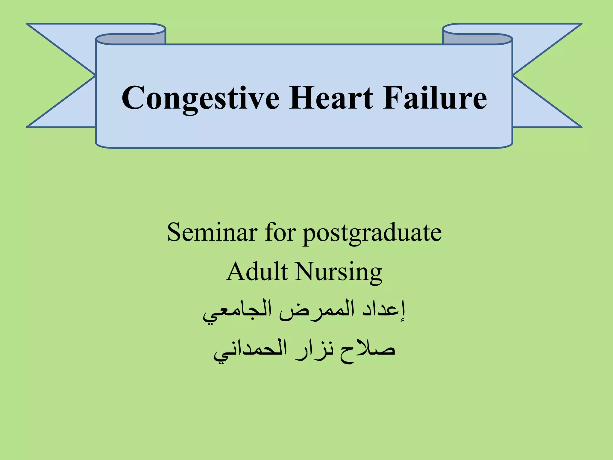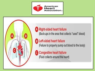 The document discusses congestive heart failure, defining it as a condition where the heart inefficiency leads to fluid accumulation and insufficient oxygen-rich blood supply to organs. It outlines various causes, clinical manifestations, diagnostic evaluations, and management strategies for the condition, including both pharmacological and non-pharmacological treatments. The need for patient education and lifestyle changes is emphasized, alongside nursing care interventions.
