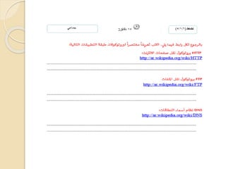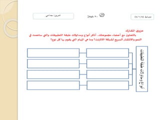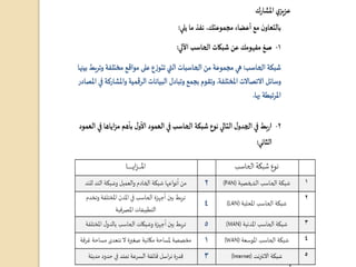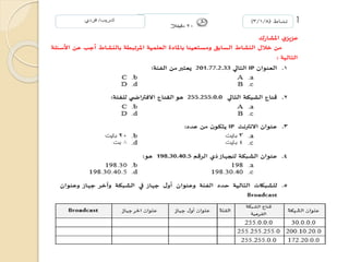 تناقش الوثيقة مواضيع الشبكات والإنترنت، مع التركيز على أنواع الشبكات المختلفة وتقنيات التبديل الشبكي. تتضمن الأهداف الأساسية تمييز بين الشبكات الإلكترونية وتحديد أنواع الشبكات مثل الشبكات المحلية والشبكات الواسعة. كما تتناول الوثيقة مكونات شبكة الإنترنت وآلية عمل بروتوكولات TCP/IP.