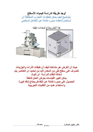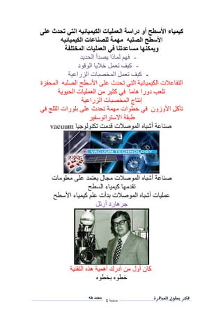 يتناول هذا النص دراسة الكيمياء السطحية وتأثيراتها على مجموعة متنوعة من العمليات الكيميائية، بما في ذلك تآكل الحديد وتحفيز التفاعلات. كما يبرز أهمية المخصبات الزراعية وإنتاج الأمونيا في الصناعة، ويتطرق إلى تقنيات التحكم في تفاعلات العوامل الكيميائية. أخيرًا، يتم تسليط الضوء على ضرورة الدقة في القياسات والتجارب لتحقيق نتائج موثوقة.