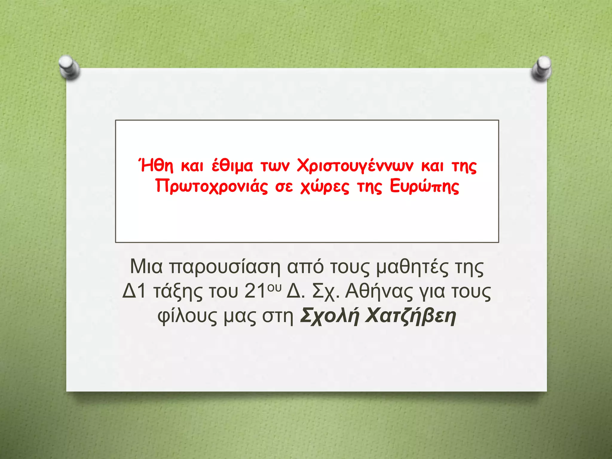 Έθιμα Χριστουγέννων και Πρωτοχρονιάς από χώρες της Ευρώπης. Μια παρουσίαση από τους μαθητές του Δ1 του 21ου Δημοτικού σχολείου Αθήνας "Λέλα Καραγιάννη". Χρησιμοποιήθηκε υλικό που μας έστειλαν άλλα ευρωπαϊκά σχολεία στα πλαίσια σχετικού προγράμματος. Οι μαθητές παρουσίασαν την εργασία τους στους μαθητές της Σχολής Χατζήβεη, κατά τη διάρκεια επίσκεψής μας στη Σχολή.