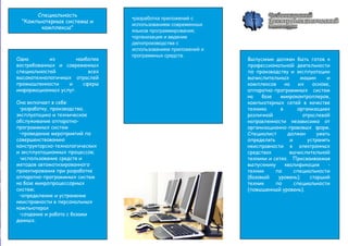 Чебоксарский электромеханический колледж предлагает специальность 'Компьютерные системы и комплексы', которая включает в себя разработку и обслуживание аппаратно-программных систем, автоматизированное проектирование и работу с базами данных. Выпускники готовы к профессиональной деятельности в различных отраслях, выполняя функции техников и старших техников. Колледж предлагает актуальные знания для успешной работы в высокотехнологичных сферах.