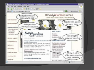 تتناول الوثيقة مبادئ تصميم المواقع الإلكترونية، مثل أهمية التصميم للواجهة المستخدم وتوافقه عبر الأنظمة الأساسية المختلفة. تؤكد الوثيقة على ضرورة اختبار التصميم والتأكد من سهولة تحميل الصفحات حتى عند سرعات اتصال منخفضة. كما تشدد على أهمية تصميم صفحات واضحة ومنظمة، مع مراعاة كيفية تفاعل المستخدم مع المحتوى.
