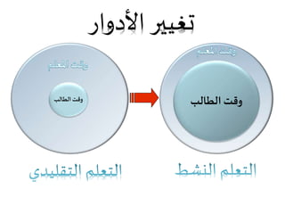 يتناول الوثيقة أساليب التعلم النشط وأهميتها في تعزيز تجربة الطلاب التعليمية من خلال تنظيم الأنشطة والتعاون. يبرز المفاهيم المختلفة مثل الذكاءات المتعددة والخرائط الذهنية وأساليب النقاش والتفاعل. كما يستعرض الوثيقة أدوات واستراتيجيات متعددة لتسهيل التعلم وتطوير المهارات الفعلية والذهنية.