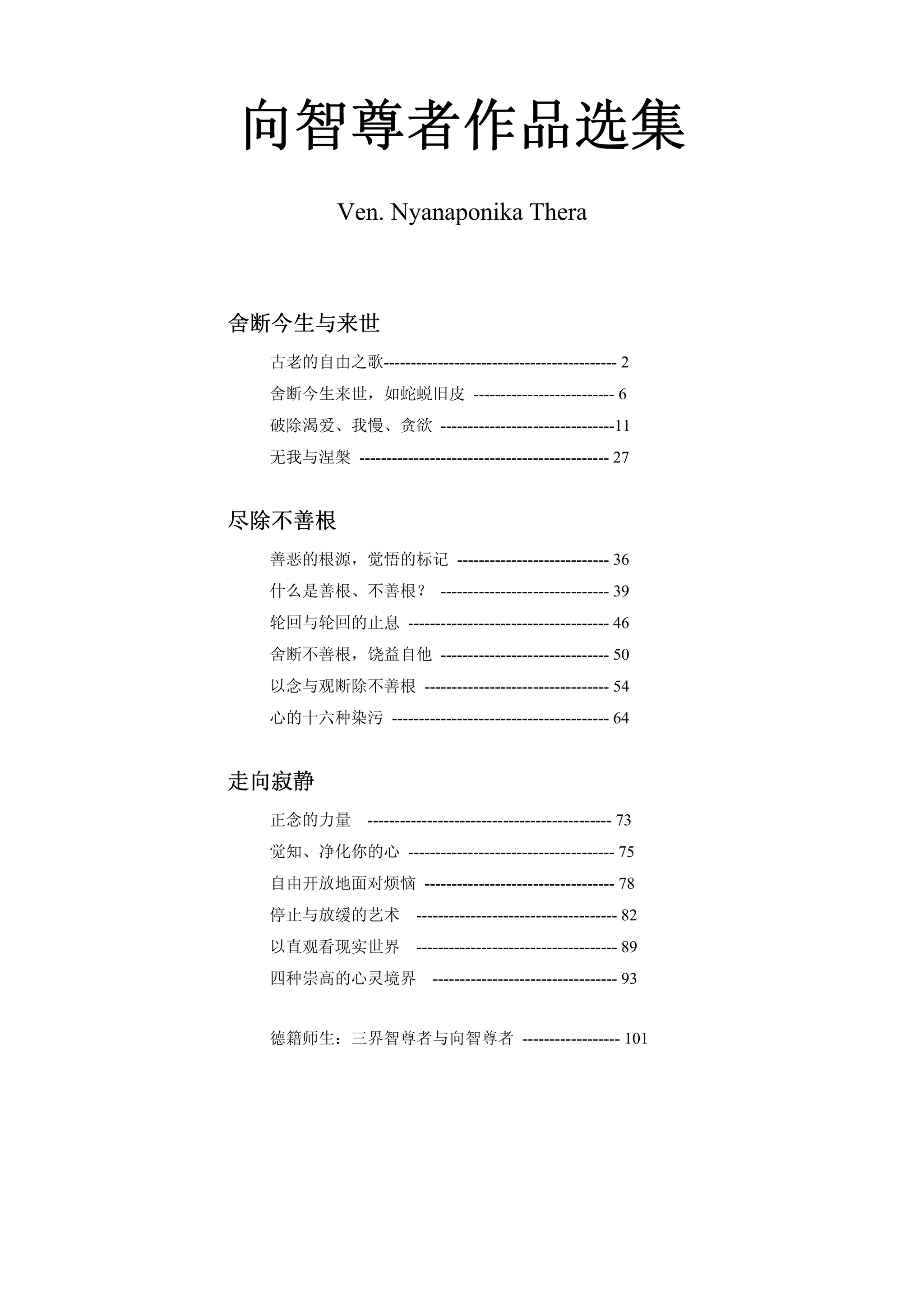本文件是向智尊者的著作选集,探讨放弃今生与来世的概念,并以蛇蜕旧皮的比喻阐释舍弃贪欲、自我与渴爱的过程,以达到真正的自由与解脱。文中强调真正的自由不是对欲望的追逐,而是通过正念与智慧的指引,超越对生活的执念与束缚。向智尊者的生平及其重要著作也在文中简要介绍,展现其对佛教思想的贡献。